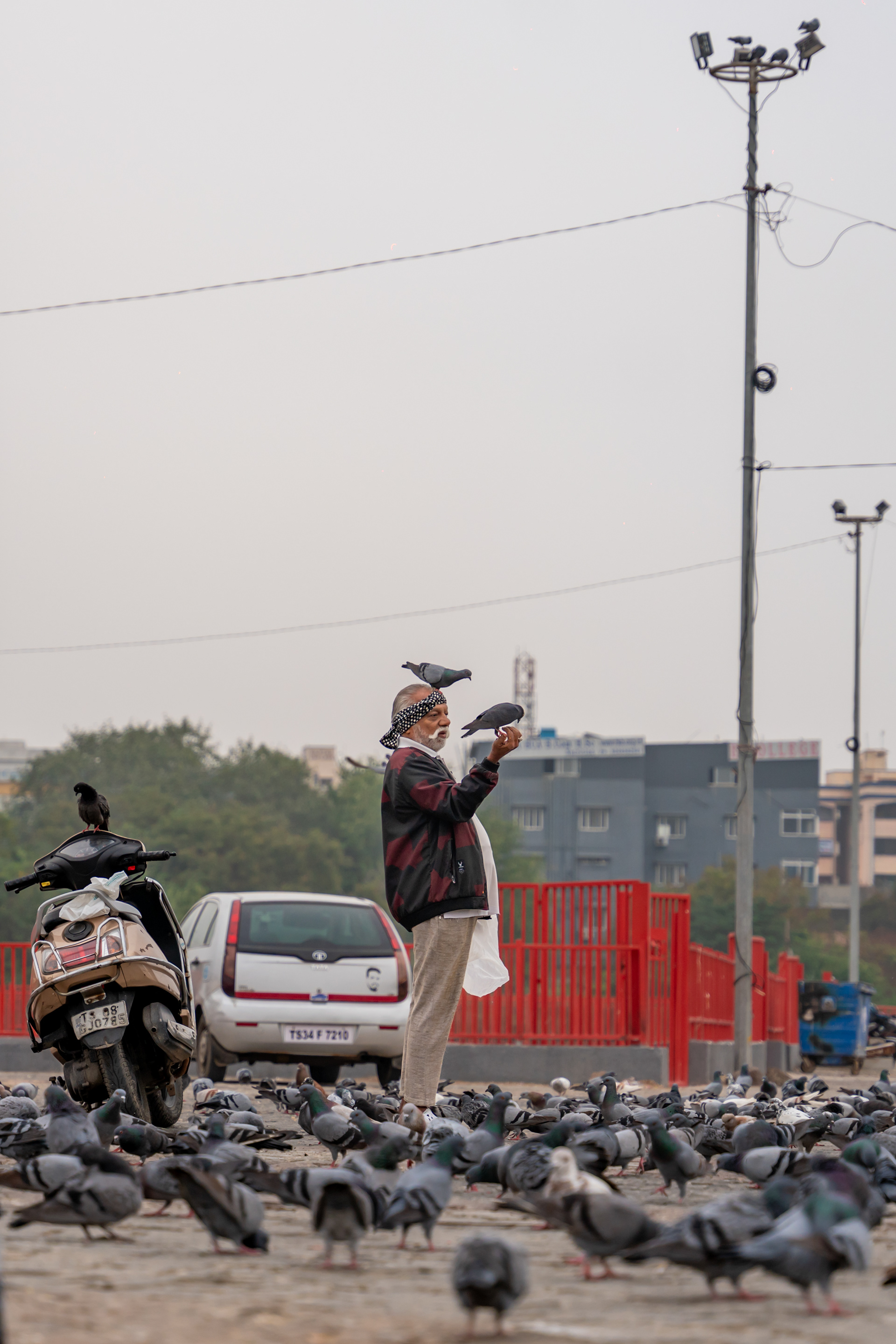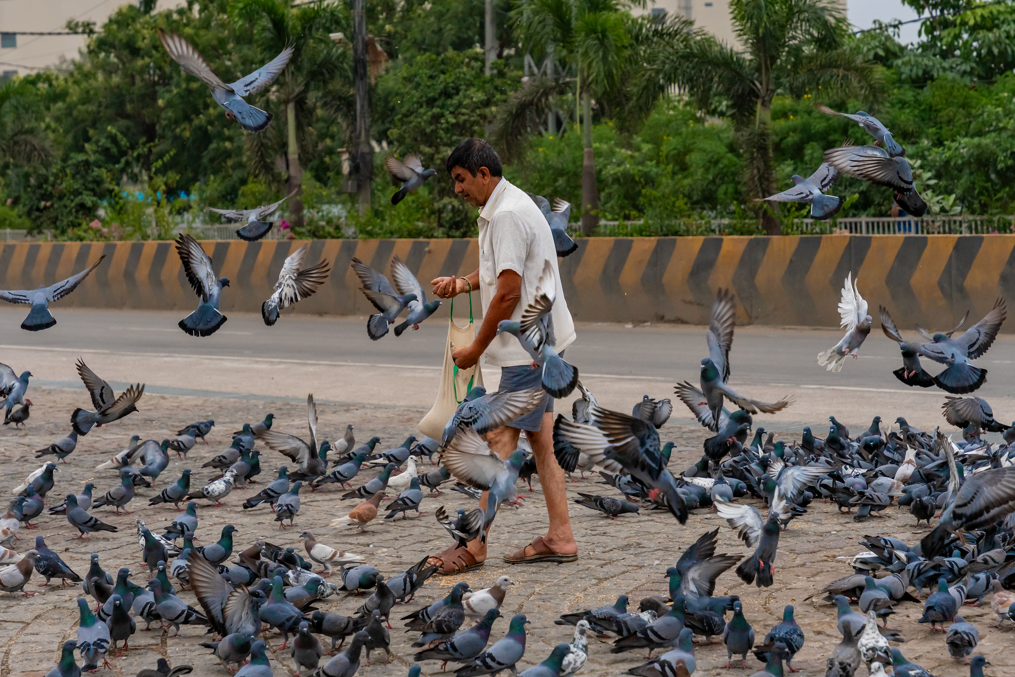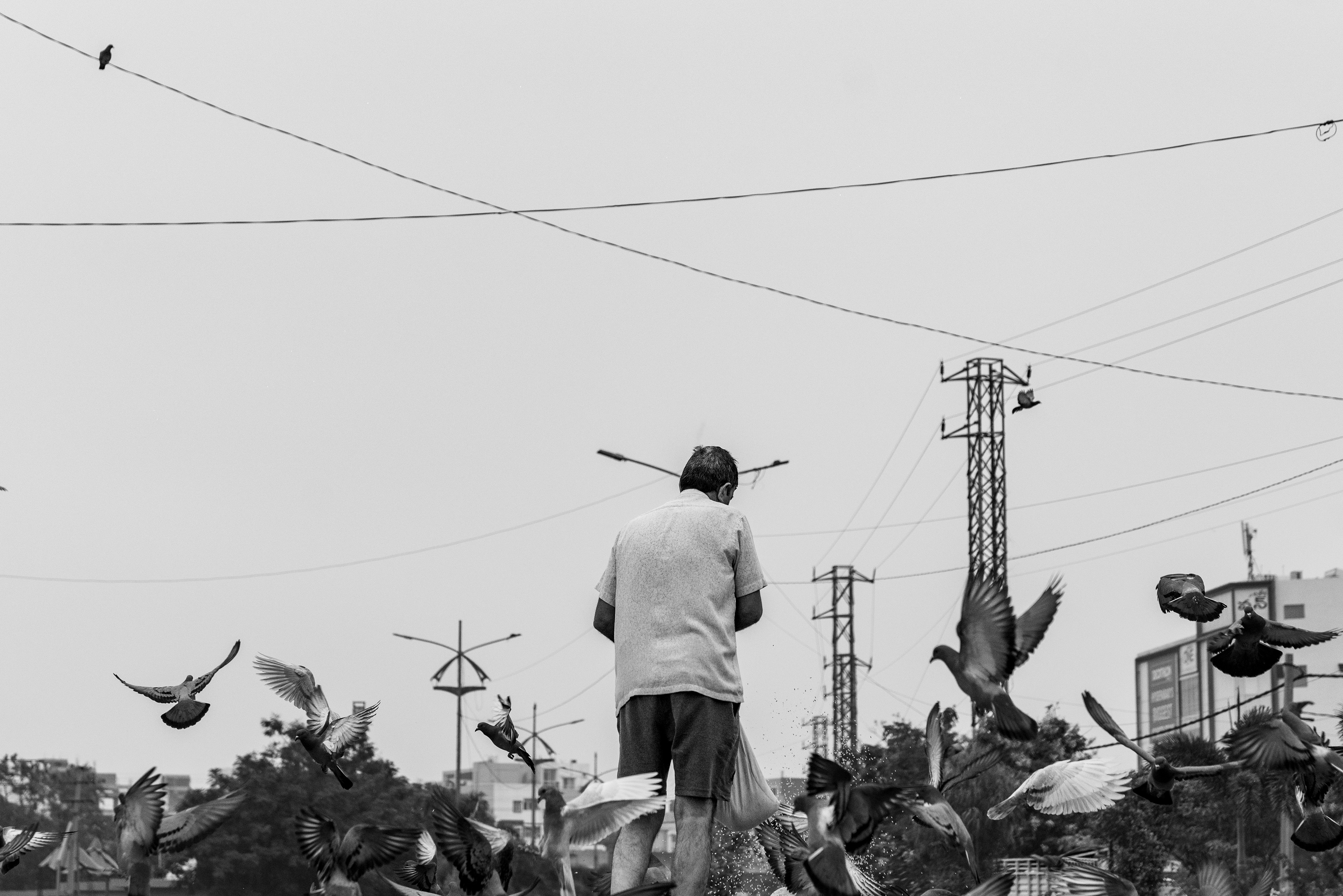 Bond between man and bird unfolds with each handful of grain, revealing a serene moment of connection and care.