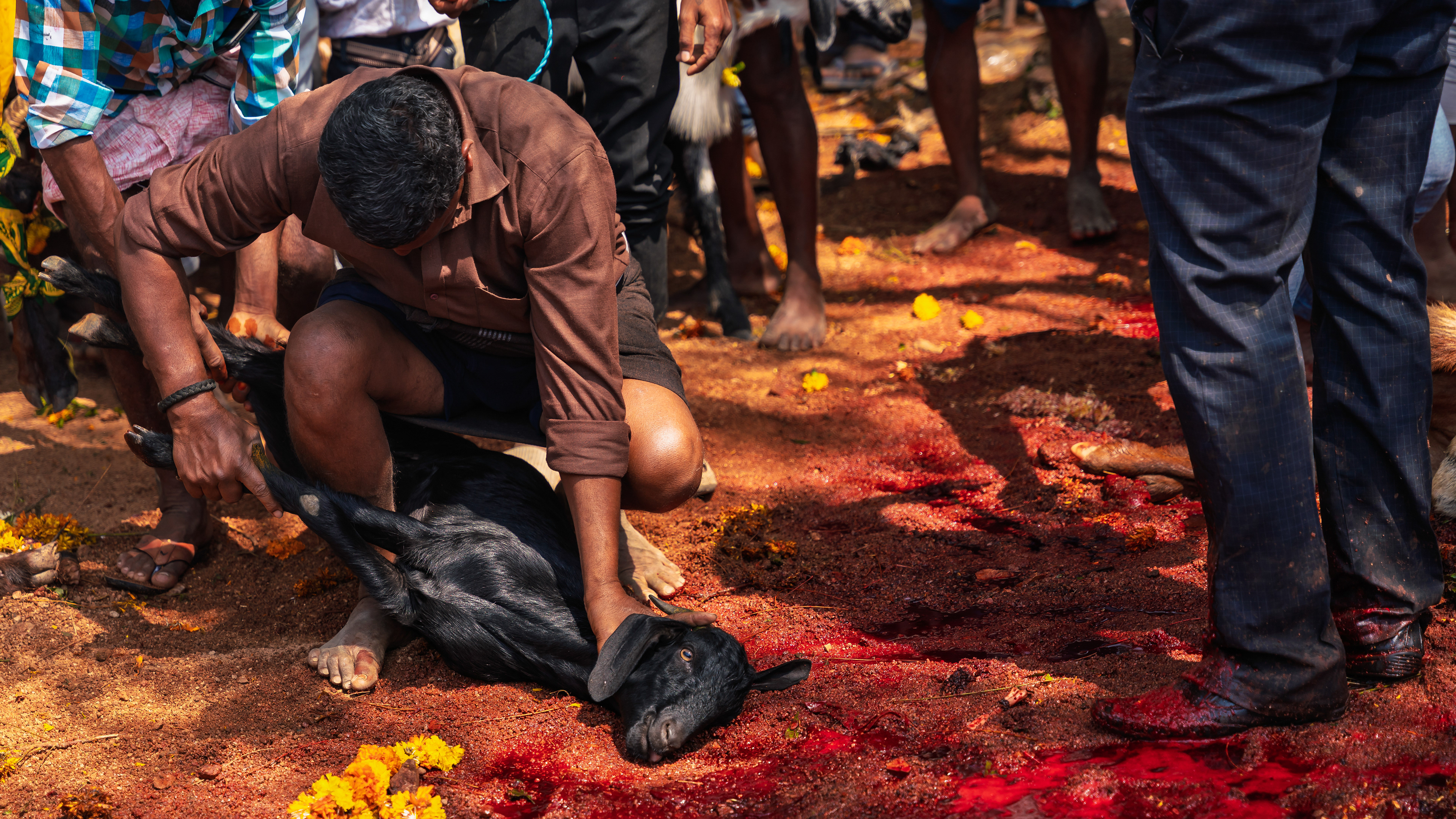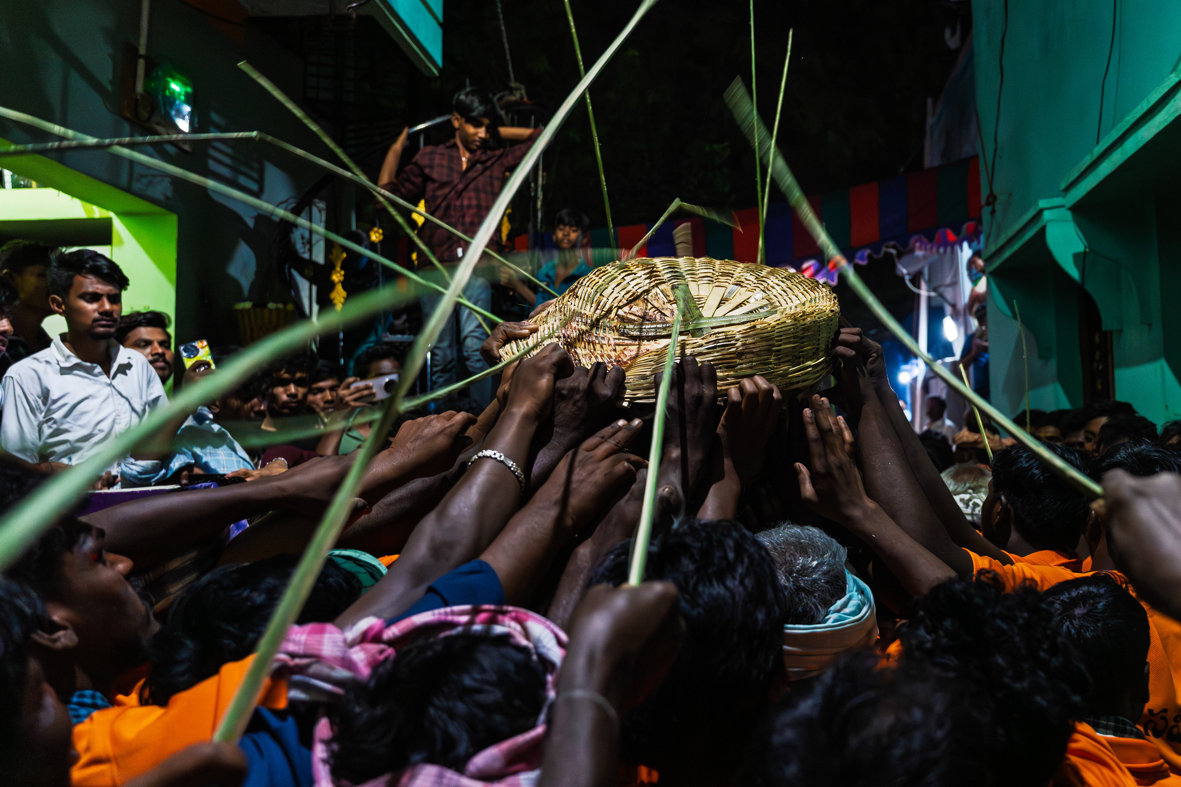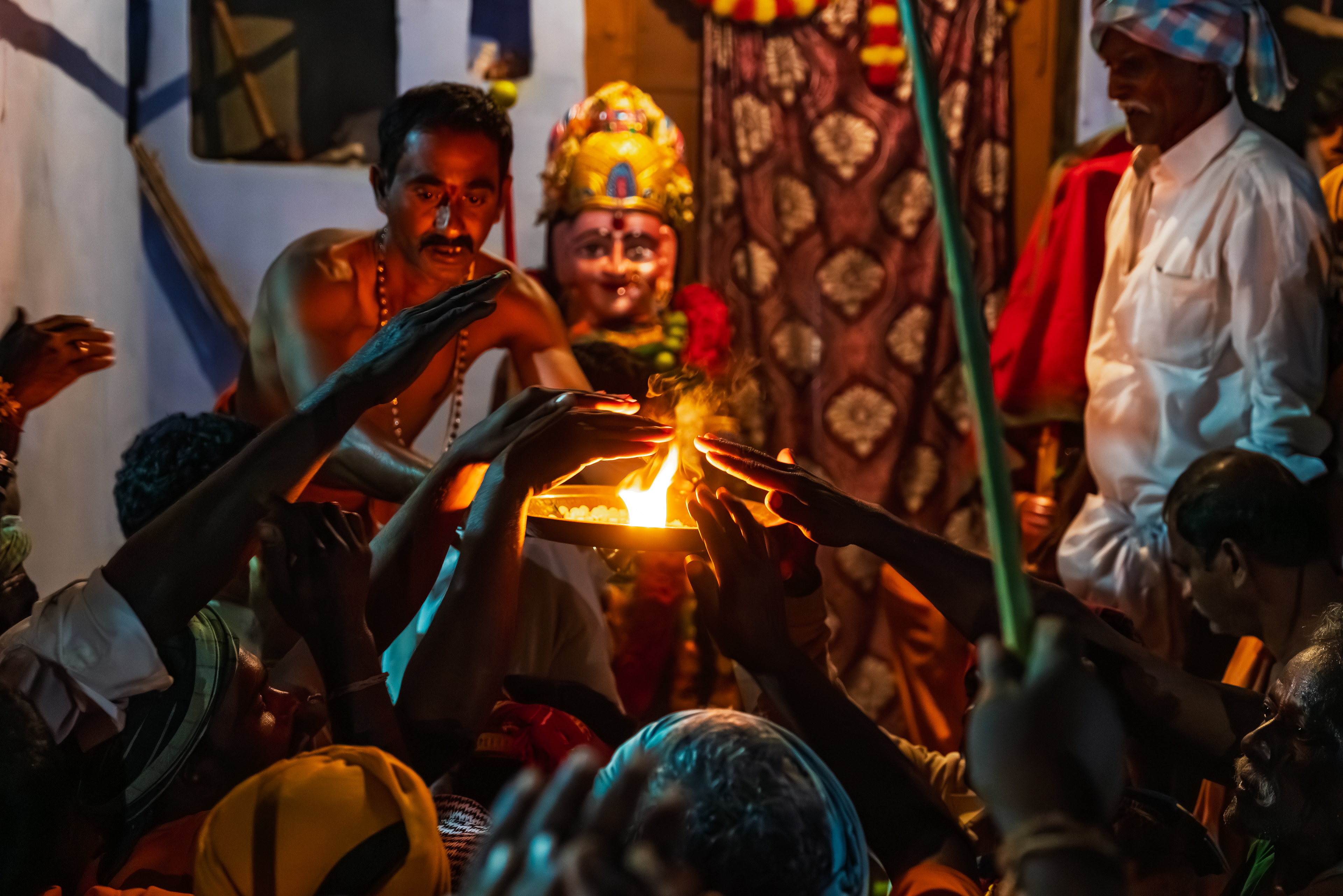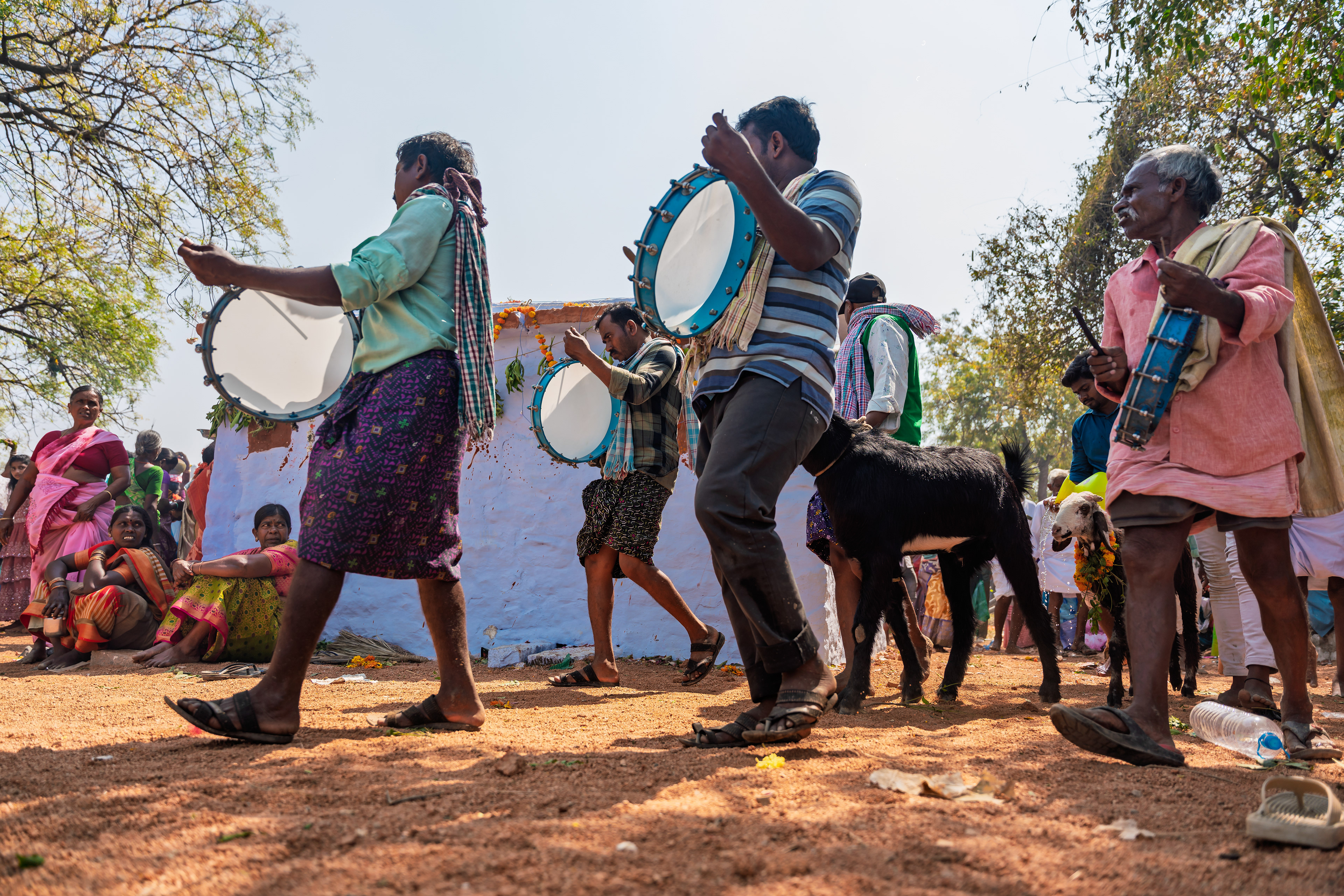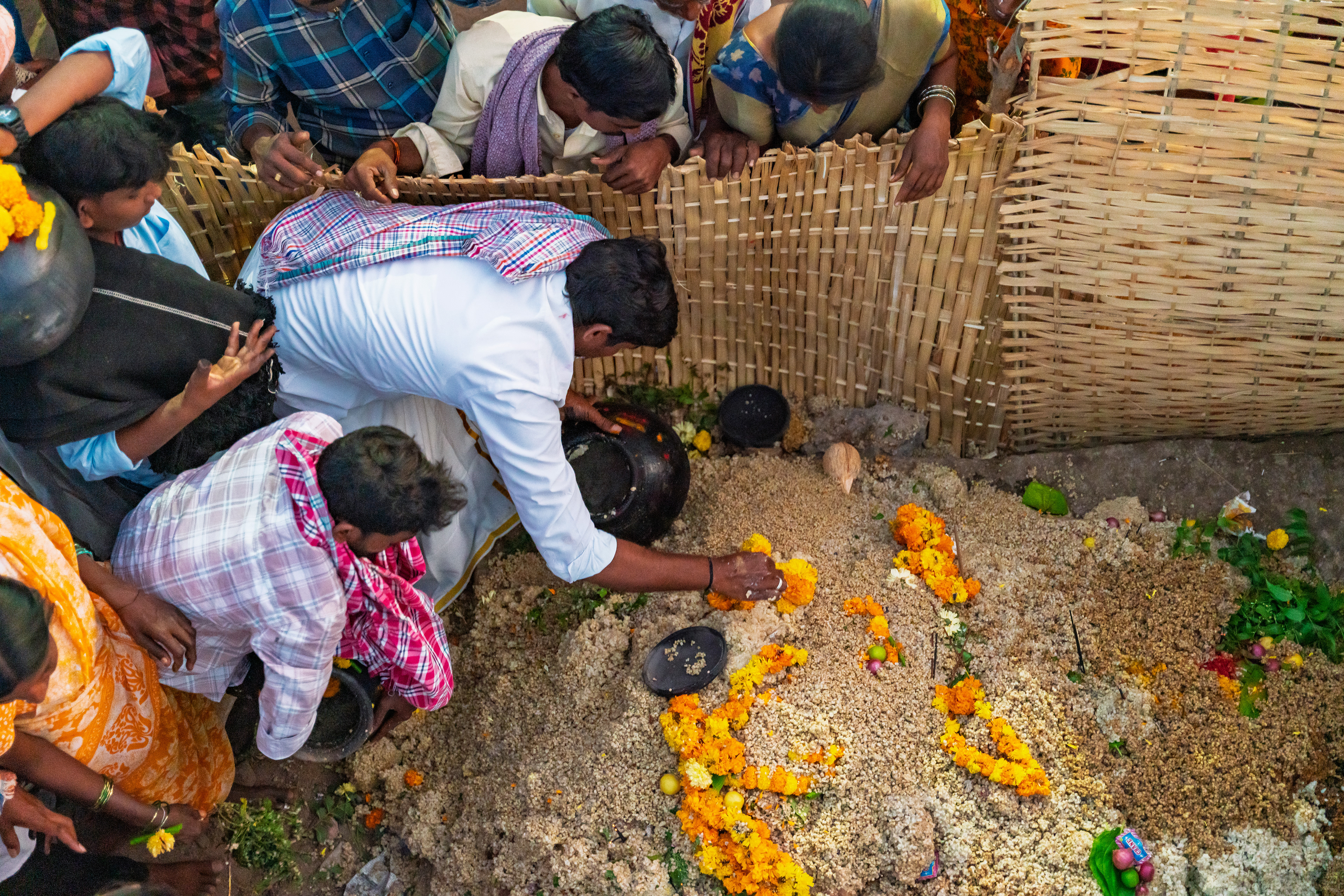 After Maaremma’s placement, Boothu Pilli, a man chosen by pre-determined village customs, is put on a sacred diet for over the past month. The evening before the event, this man is given a deep cleansing and a shave to make sure no hair exists on his entire skin. Boothu Pilli, now covered with neem leaves around his privates, walks around the village perimeter carrying the “Jonna Buvva”- the sorghum dish accompanied by a group of villagers carrying sacrificial lambs. While he walks around, anywhere this man feels even an ounce of negativity, he stops and slices the stomach of a lamb and places it alongside the sacrifice. Upon reaching Peddhamma goddess's temple in the middle of the village, after his sacrificial walk, he is given a cloth to cover himself and is kept safely in a nearby house. By this time it's alright past midnight and the main ritual starts now.