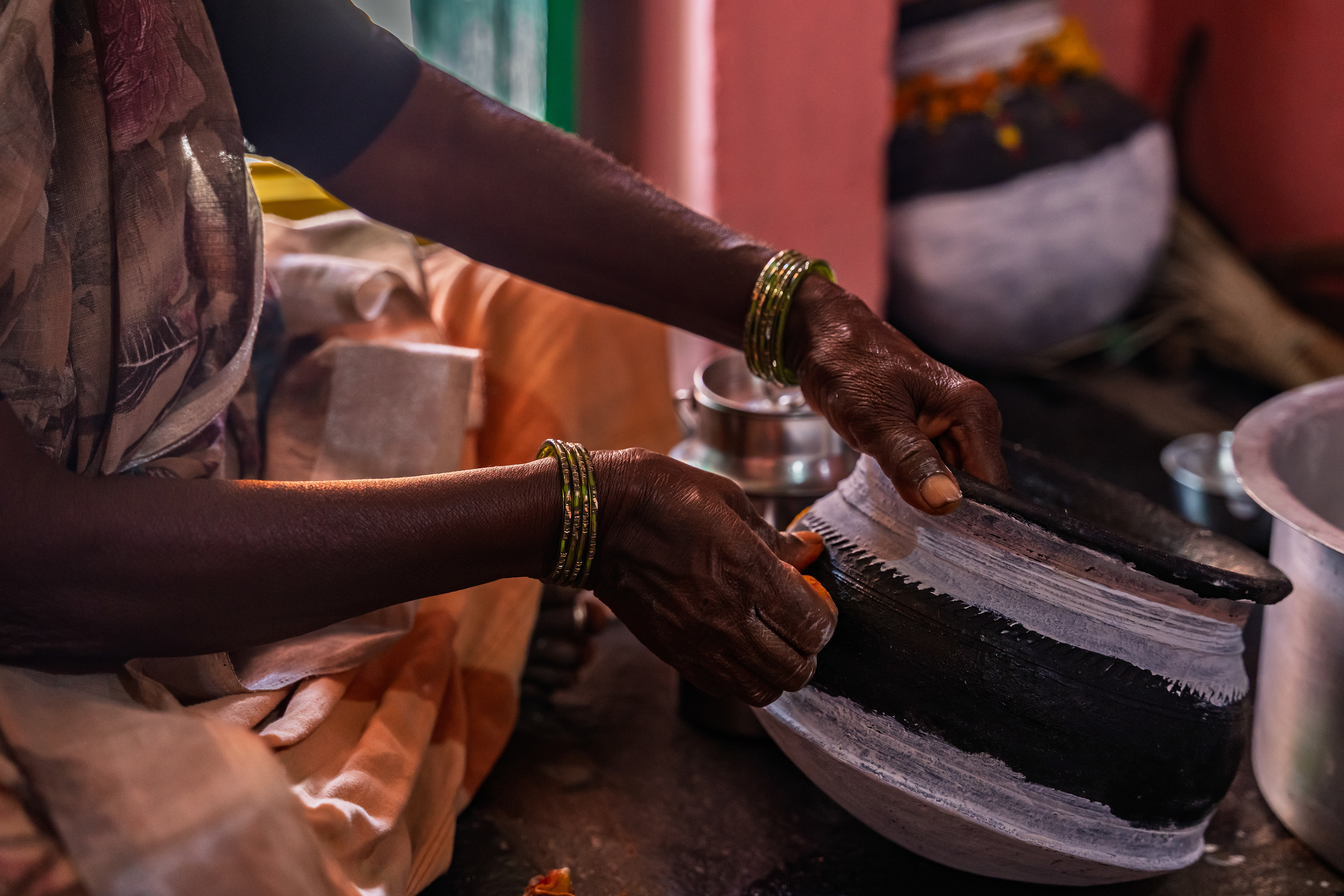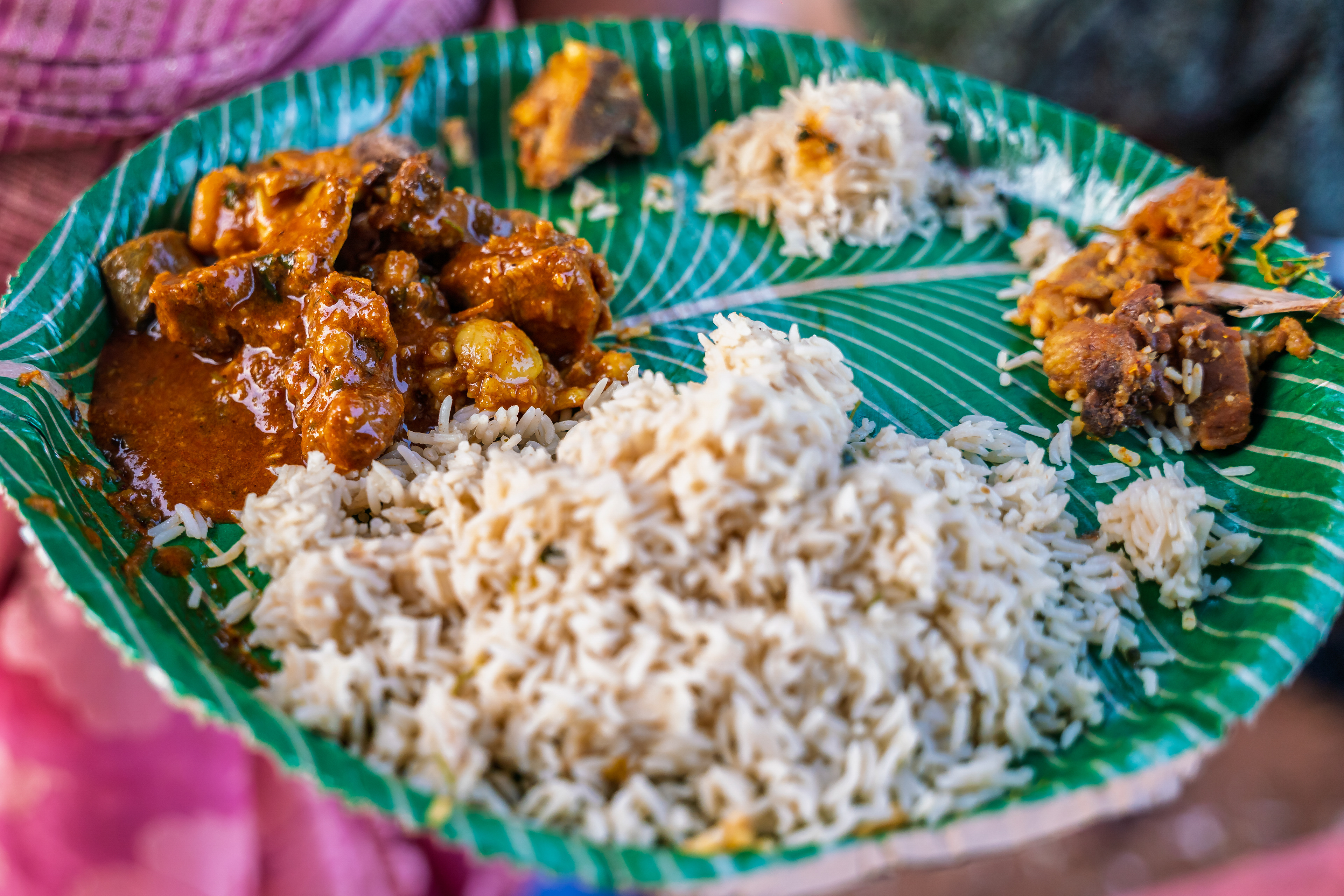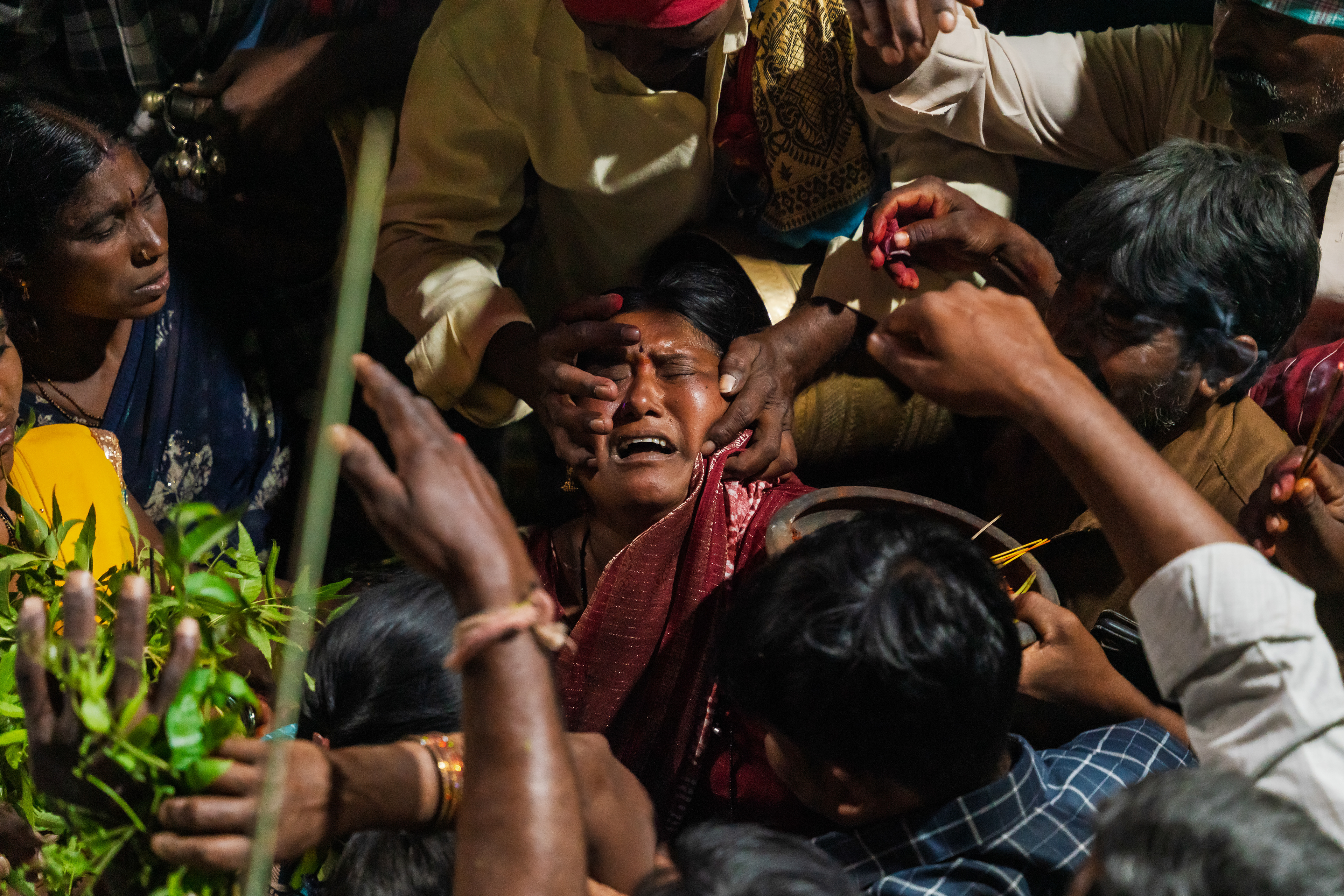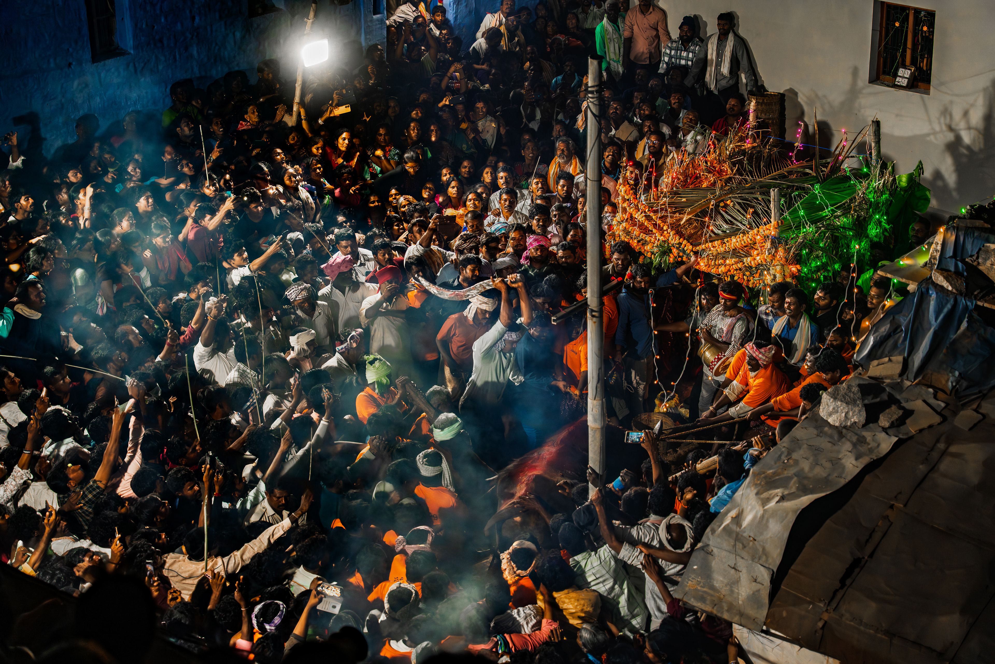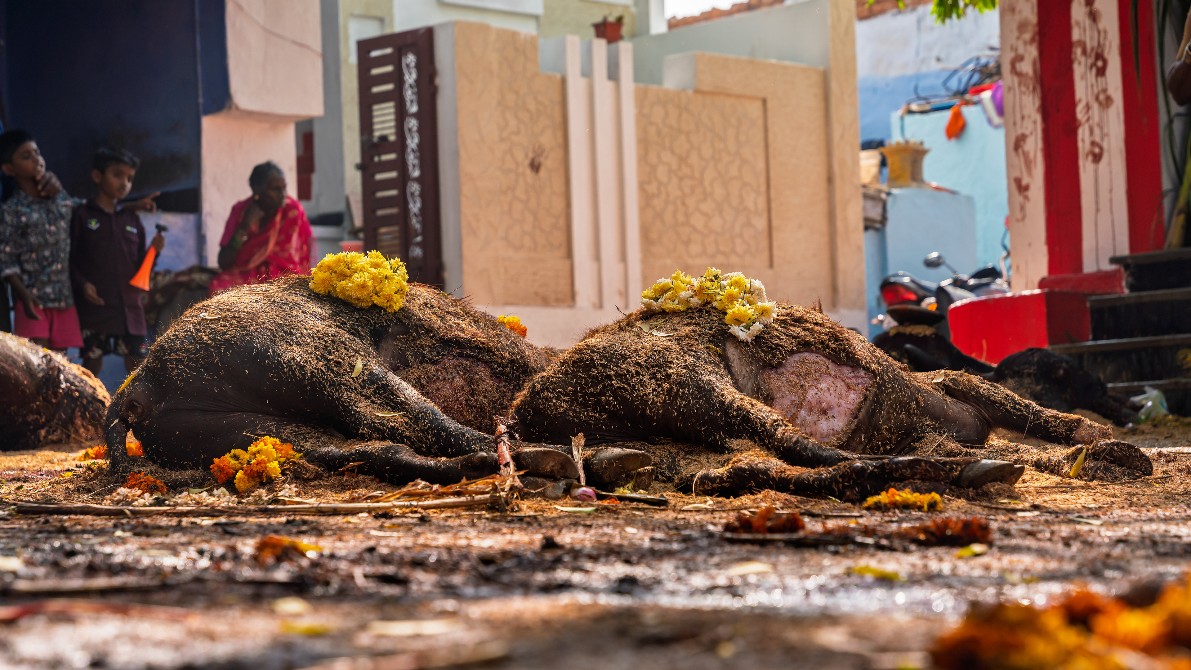 After Maaremma’s placement, Boothu Pilli, a man chosen by pre-determined village customs, is put on a sacred diet for over the past month. The evening before the event, this man is given a deep cleansing and a shave to make sure no hair exists on his entire skin. Boothu Pilli, now covered with neem leaves around his privates, walks around the village perimeter carrying the “Jonna Buvva”- the sorghum dish accompanied by a group of villagers carrying sacrificial lambs. While he walks around, anywhere this man feels even an ounce of negativity, he stops and slices the stomach of a lamb and places it alongside the sacrifice. Upon reaching Peddhamma goddess's temple in the middle of the village, after his sacrificial walk, he is given a cloth to cover himself and is kept safely in a nearby house. By this time it's alright past midnight and the main ritual starts now.
