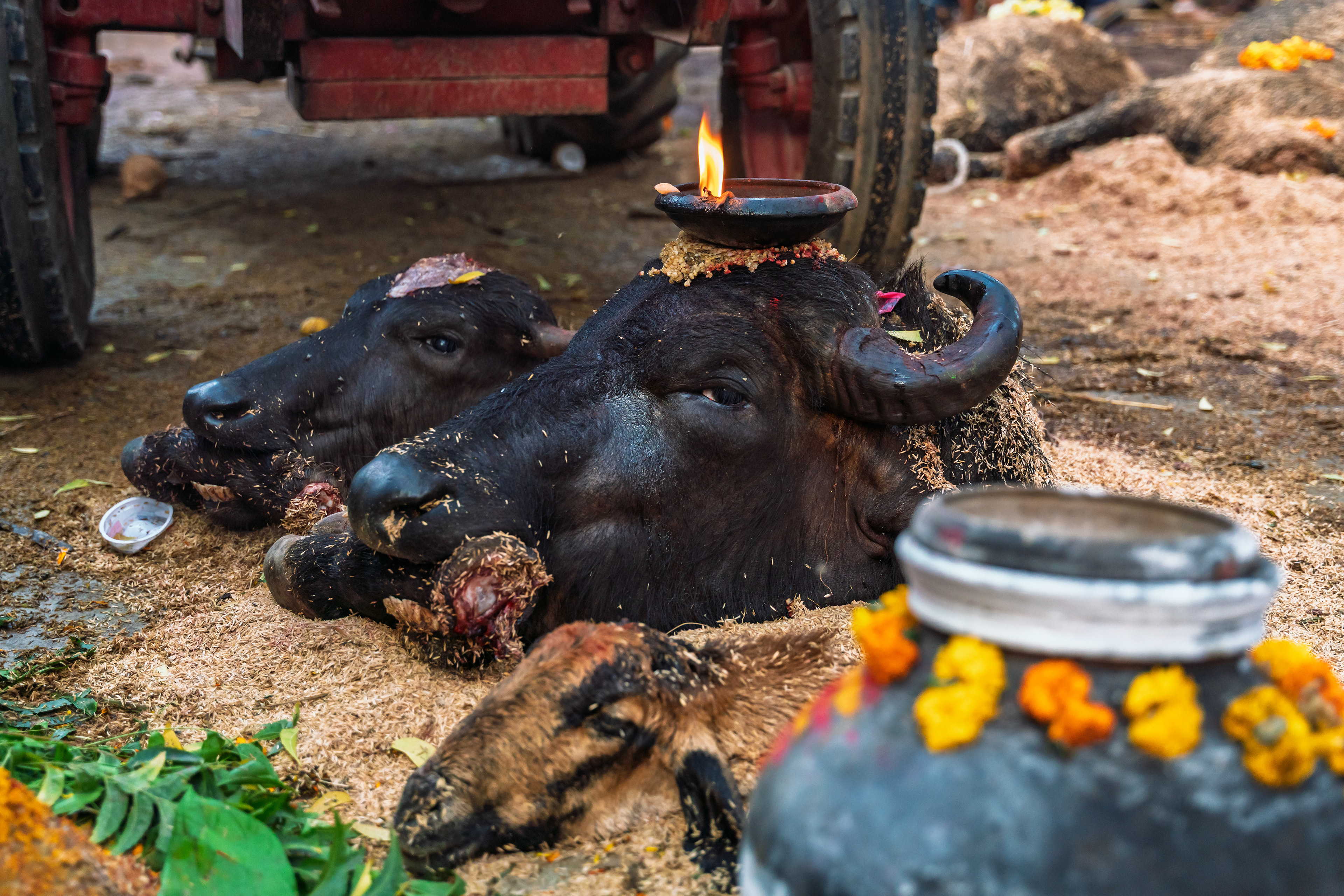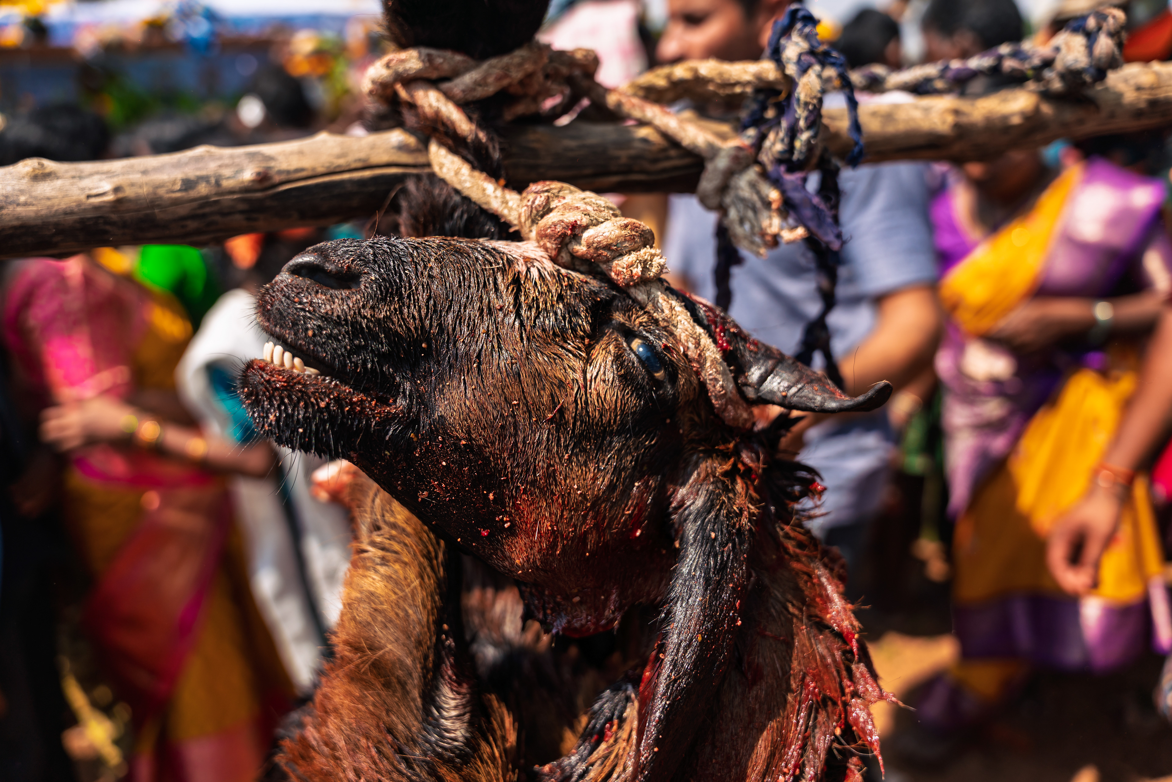 The butcher does Aayudha Pooja to his knife and applies kumkum and turmeric. Dreading to be bashed by the villagers if he crossed more than 10 strikes, he takes a deep breath before slashing the buffalo. 1… 2… 5… 10… the butcher successfully decapitates the buffalo. Poli, an offering, is made by mixing Jonna Buvva and the blood of both sacrificial animals. This Poli is considered holy and is believed to ward off evil and contain all the benefits of the ritual. Which is why, only village natives are allowed to stay in the ritual premises to make sure others are not reaping the ritualistic benefits.