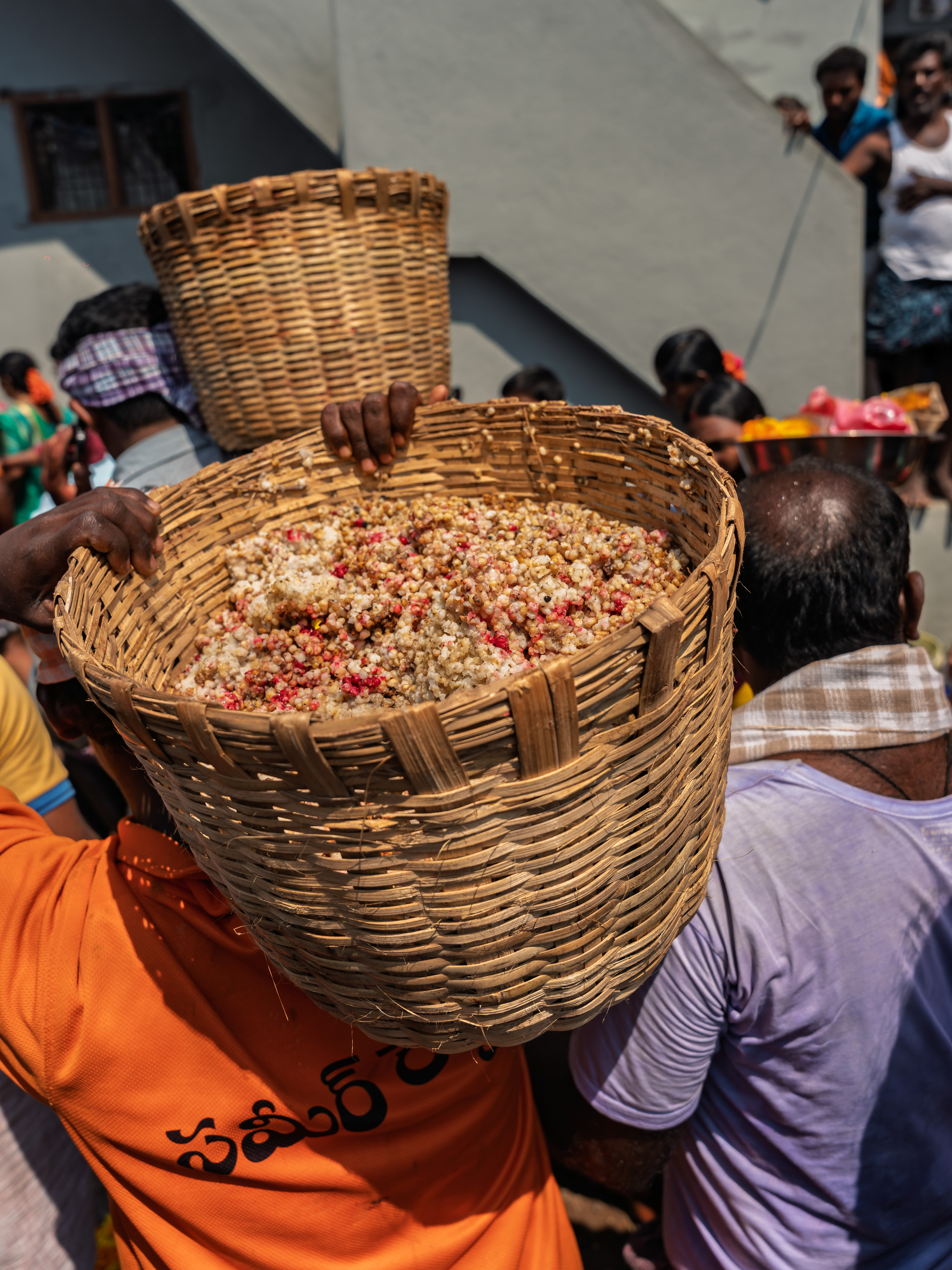 Now, the Poli, the Jonna Buvva from the village corners and from the perimeter that was kept by Boothu Pilli is mixed with the blood from all the sacrificial animals. This mixture is then moved to multiple baskets and are taken by a group of villagers to each and every house in the village. This mixture is spread around each and every door of the village. Once the spread is successfully finished, the villagers start cleansing their houses.