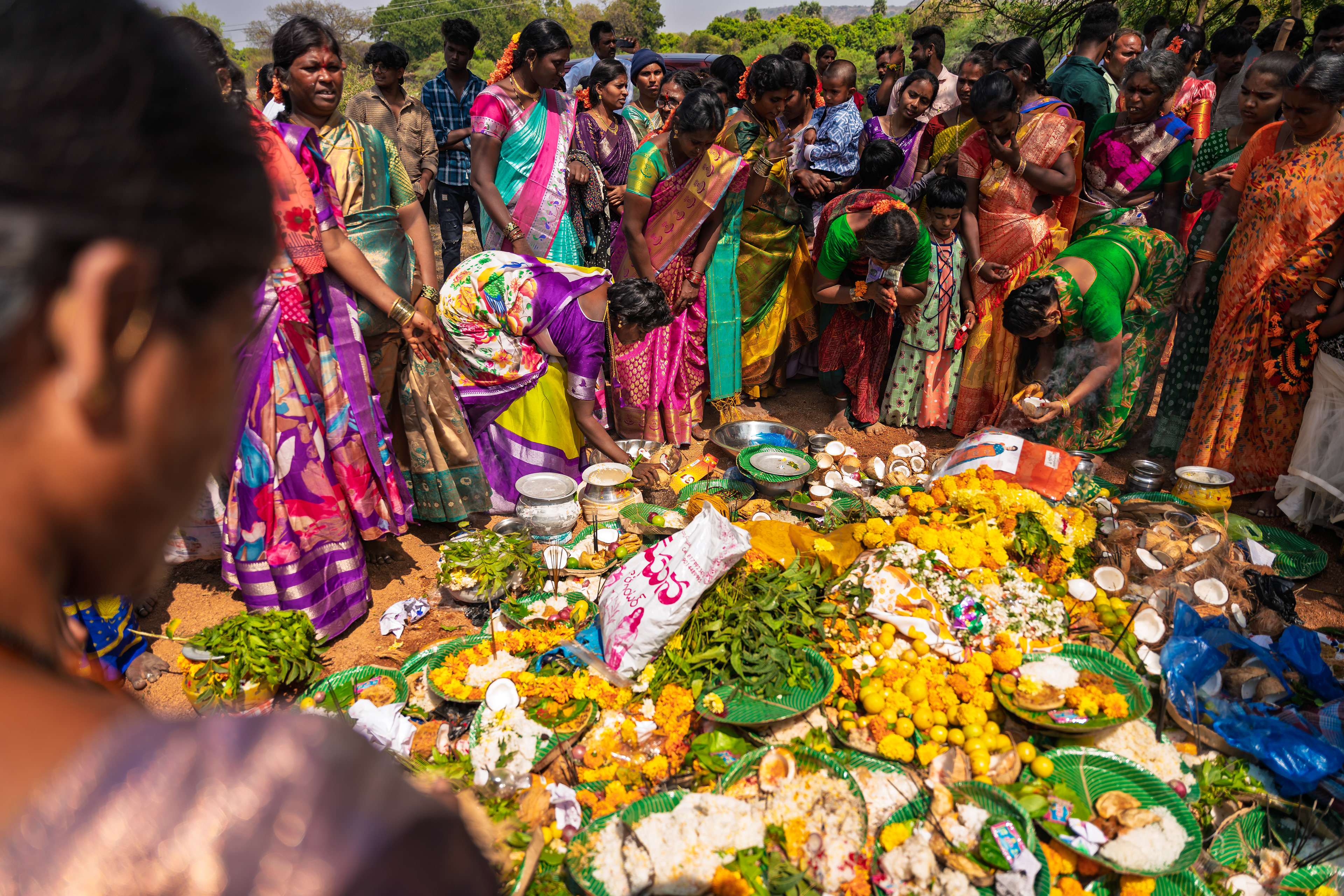 The evening before the actual event Devara, villagers take bonam that contains Jonna Buvva, a dish made of sorghum and place them in each corner of the village.
